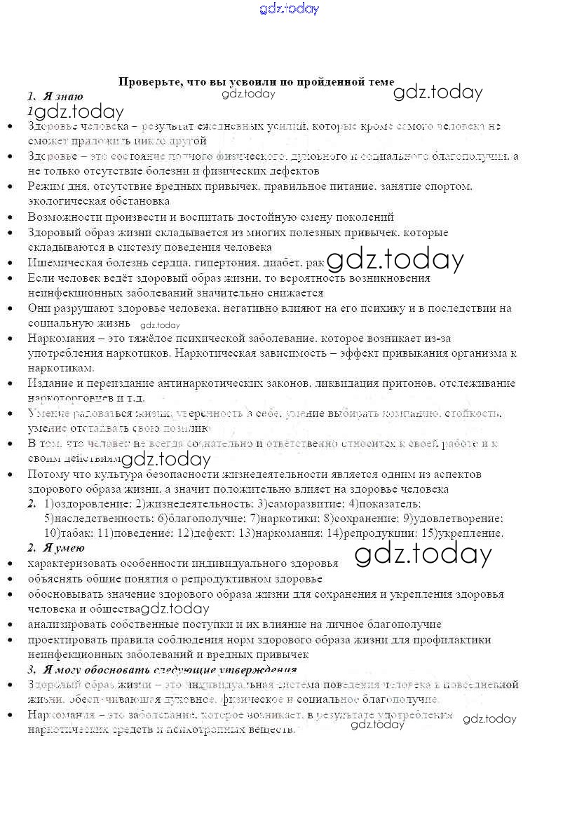 На страницах сайта gdz.today вы найдете учебный и вспомогательный материал, направленный на улучшения знаний школьной программы. ГДЗ - онлайн мир знаний Решение к главе 8 Проверьте свои знания Рабочей тетради по ОБЖ для 8 класса Смирнов, Хренников Просвещение 2013