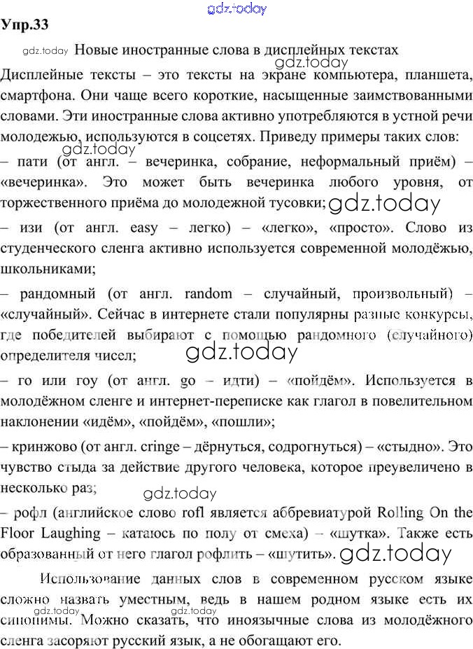 На страницах сайта gdz.today вы найдете учебный и вспомогательный материал, направленный на улучшения знаний школьной программы. ГДЗ - онлайн мир знаний Решение к упражнениям 33 Учебнику по Русскому языку для 8 класса Александрова, Загоровская Просвещение 2020