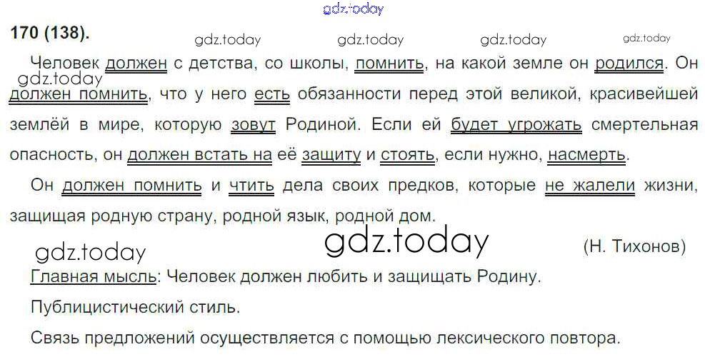 На страницах сайта gdz.today вы найдете учебный и вспомогательный материал, направленный на улучшения знаний школьной программы. ГДЗ - онлайн мир знаний Решение к упражнениям 170 Учебнику по Русскому языку для 8 класса Бархударов, Крючков Просвещение 2018