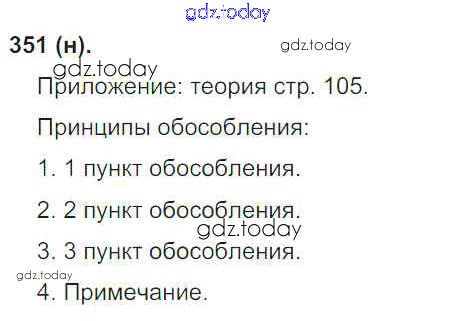 На страницах сайта gdz.today вы найдете учебный и вспомогательный материал, направленный на улучшения знаний школьной программы. ГДЗ - онлайн мир знаний Решение к упражнениям 351 Учебнику по Русскому языку для 8 класса Бархударов, Крючков Просвещение 2018