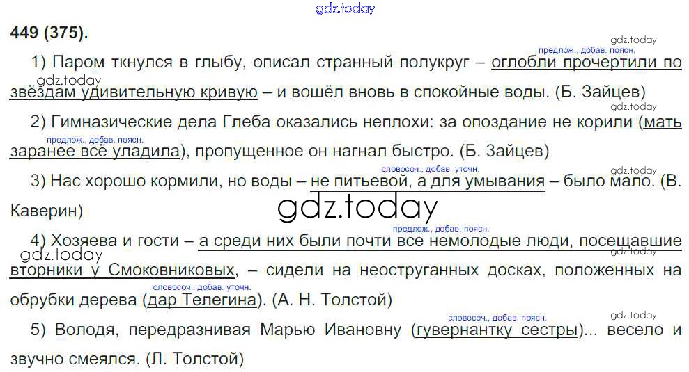 На страницах сайта gdz.today вы найдете учебный и вспомогательный материал, направленный на улучшения знаний школьной программы. ГДЗ - онлайн мир знаний Решение к упражнениям 449 Учебнику по Русскому языку для 8 класса Бархударов, Крючков Просвещение 2018