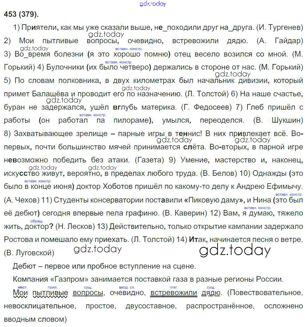 На страницах сайта gdz.today вы найдете учебный и вспомогательный материал, направленный на улучшения знаний школьной программы. ГДЗ - онлайн мир знаний Решение к упражнениям 453 Учебнику по Русскому языку для 8 класса Бархударов, Крючков Просвещение 2018