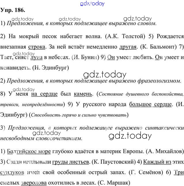 На страницах сайта gdz.today вы найдете учебный и вспомогательный материал, направленный на улучшения знаний школьной программы. ГДЗ - онлайн мир знаний Упражнения Часть 1 (решение) 186 Учебнику по Русскому языку для 8 класса Быстрова, Кибирева Русское слово Инновационная школа 2019