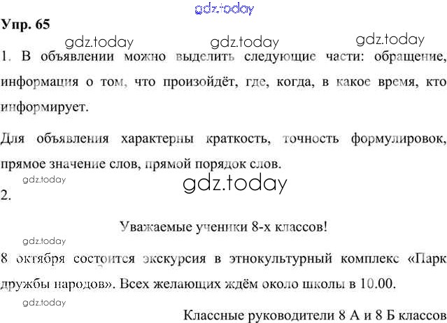 На страницах сайта gdz.today вы найдете учебный и вспомогательный материал, направленный на улучшения знаний школьной программы. ГДЗ - онлайн мир знаний Упражнения Часть 1 (решение) 65 Учебнику по Русскому языку для 8 класса Быстрова, Кибирева Русское слово Инновационная школа 2019