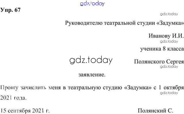 На страницах сайта gdz.today вы найдете учебный и вспомогательный материал, направленный на улучшения знаний школьной программы. ГДЗ - онлайн мир знаний Упражнения Часть 1 (решение) 67 Учебнику по Русскому языку для 8 класса Быстрова, Кибирева Русское слово Инновационная школа 2019