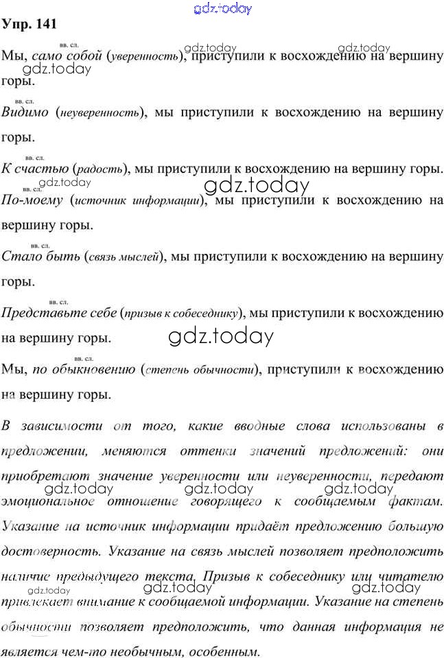 На страницах сайта gdz.today вы найдете учебный и вспомогательный материал, направленный на улучшения знаний школьной программы. ГДЗ - онлайн мир знаний Упражнения Часть 2 (решение) 141 Учебнику по Русскому языку для 8 класса Быстрова, Кибирева Русское слово Инновационная школа 2019