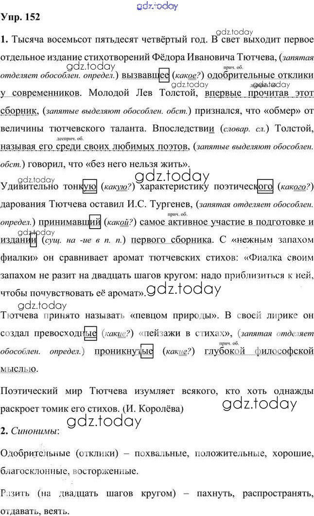 На страницах сайта gdz.today вы найдете учебный и вспомогательный материал, направленный на улучшения знаний школьной программы. ГДЗ - онлайн мир знаний Упражнения Часть 2 (решение) 152 Учебнику по Русскому языку для 8 класса Быстрова, Кибирева Русское слово Инновационная школа 2019