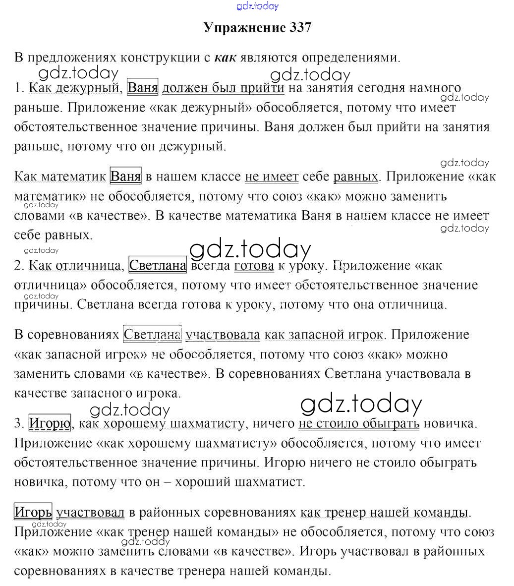 На страницах сайта gdz.today вы найдете учебный и вспомогательный материал, направленный на улучшения знаний школьной программы. ГДЗ - онлайн мир знаний Решение к заданиям 337 Учебнику по Русскому языку для 8 класса Мурина, Игнатович Национальный институт образования 2018