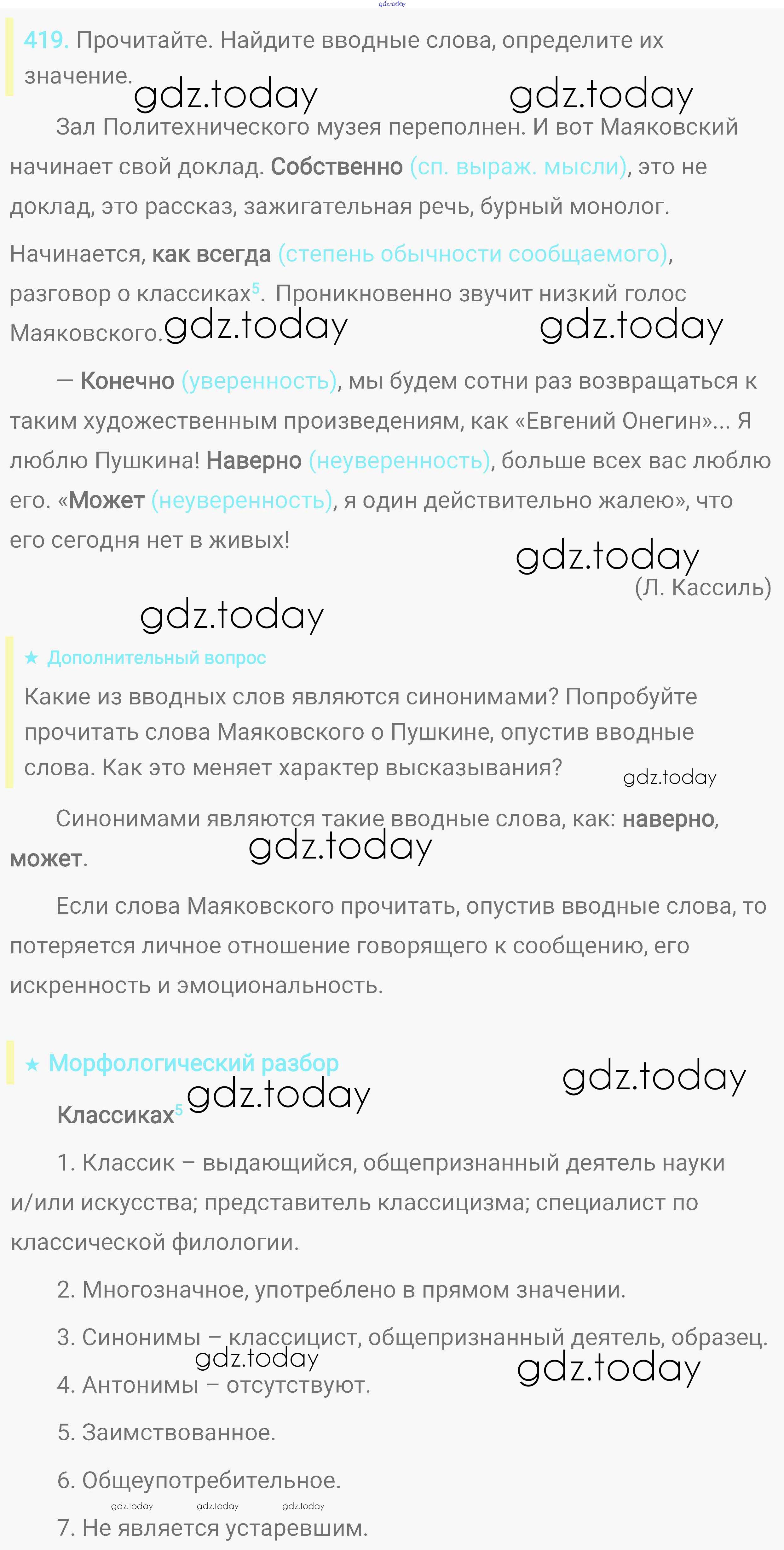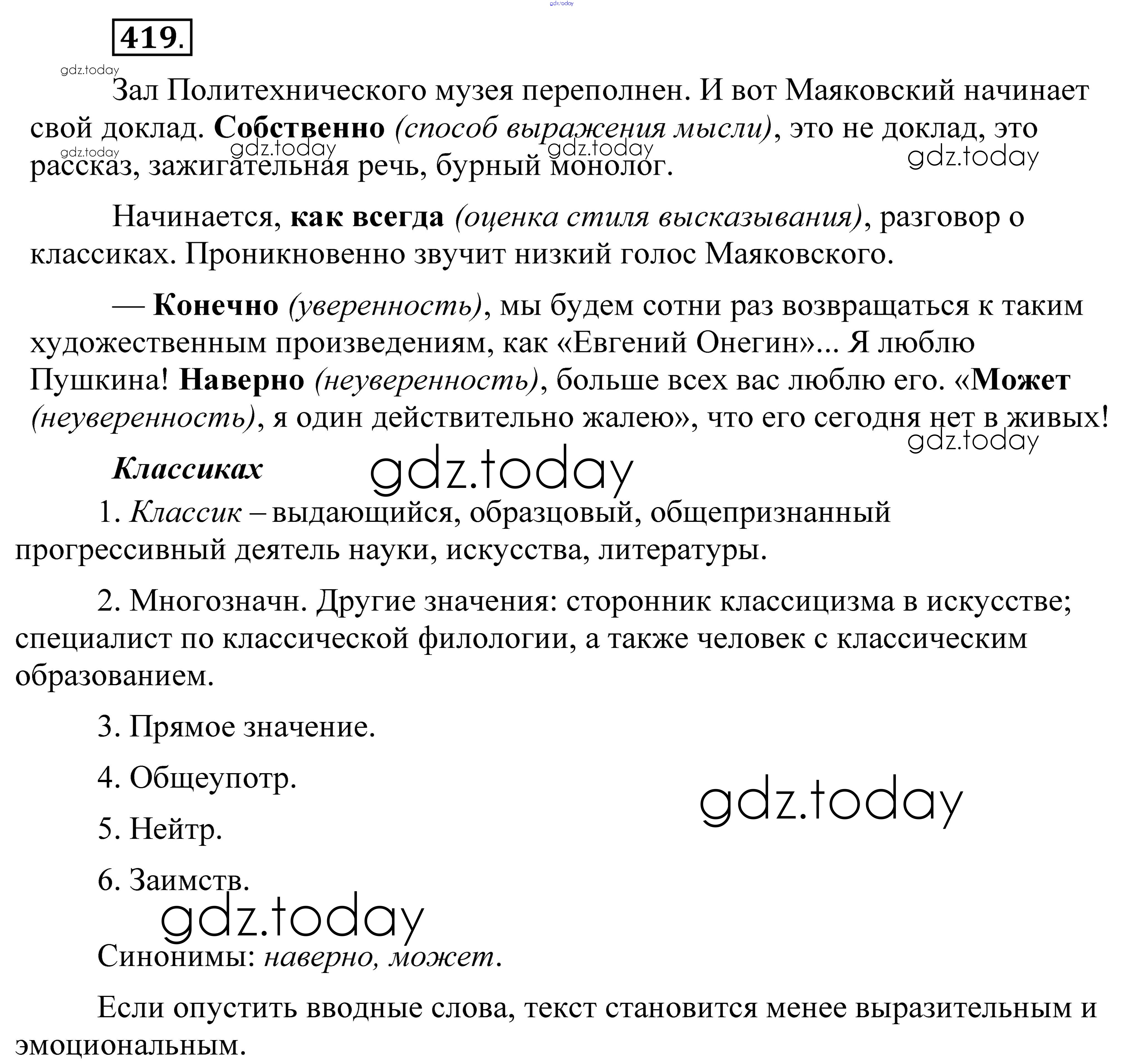 На страницах сайта gdz.today вы найдете учебный и вспомогательный материал, направленный на улучшения знаний школьной программы. ГДЗ - онлайн мир знаний Решение. Упражнения 419 Практике по Русскому языку для 8 класса Пичугов, Еремеева Дрофа, Дрофа Вертикаль 2016, 2022