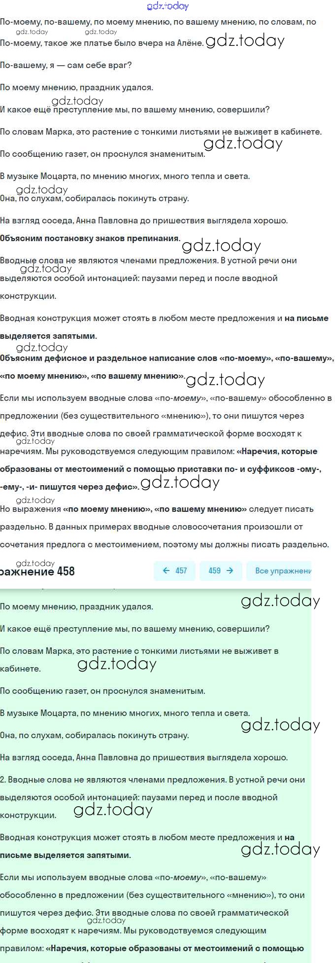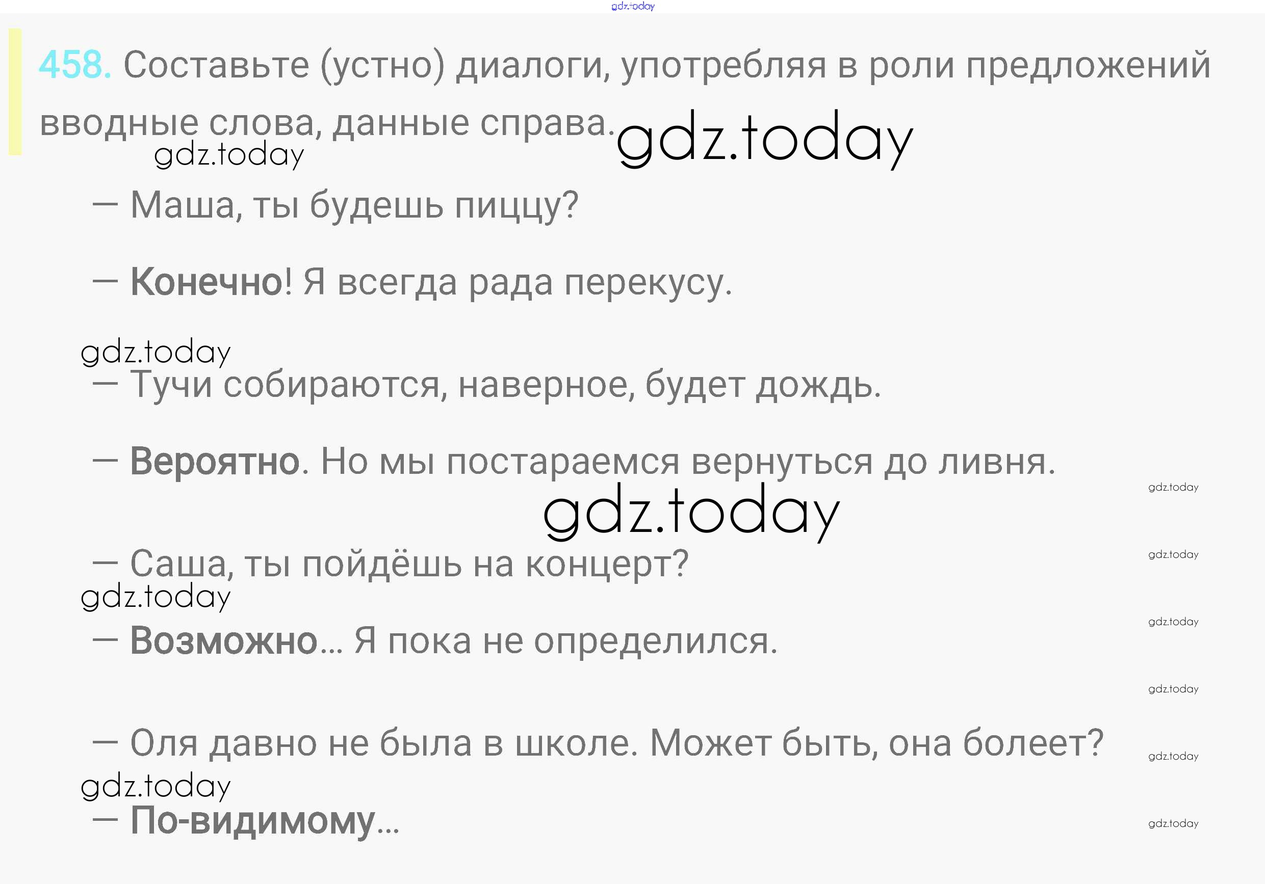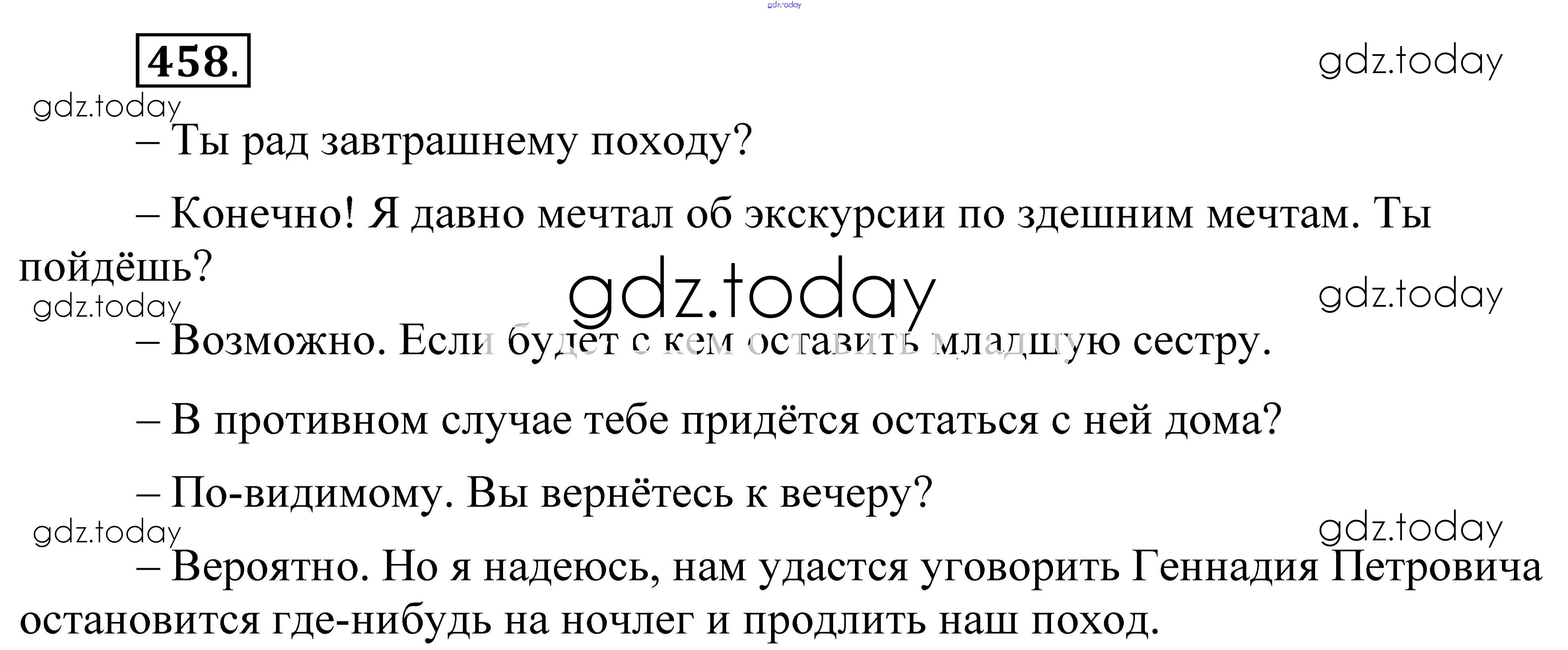 На страницах сайта gdz.today вы найдете учебный и вспомогательный материал, направленный на улучшения знаний школьной программы. ГДЗ - онлайн мир знаний Решение. Упражнения 458 Практике по Русскому языку для 8 класса Пичугов, Еремеева Дрофа, Дрофа Вертикаль 2016, 2022