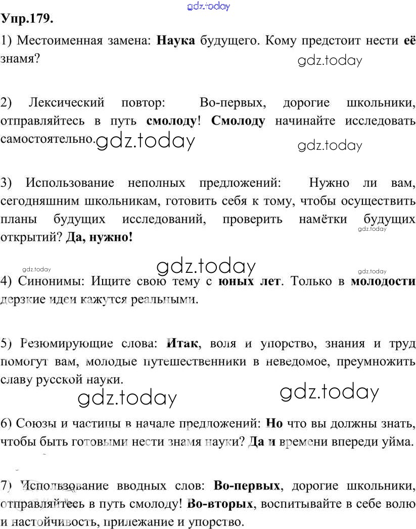 На страницах сайта gdz.today вы найдете учебный и вспомогательный материал, направленный на улучшения знаний школьной программы. ГДЗ - онлайн мир знаний Решение к упражнениям 179 Учебнику по Русскому языку для 8 класса Разумовская, Львова Дрофа Вертикаль 2013