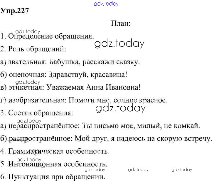 На страницах сайта gdz.today вы найдете учебный и вспомогательный материал, направленный на улучшения знаний школьной программы. ГДЗ - онлайн мир знаний Решение к упражнениям 227 Учебнику по Русскому языку для 8 класса Разумовская, Львова Дрофа Вертикаль 2013