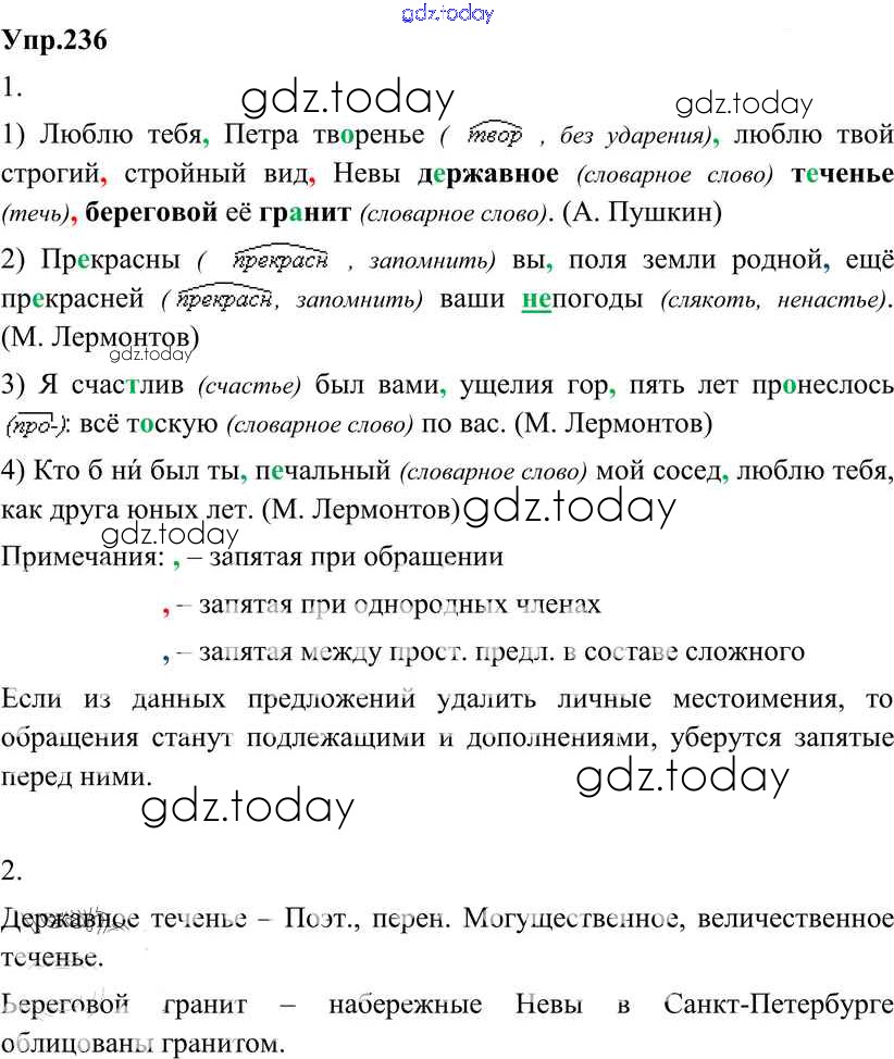 На страницах сайта gdz.today вы найдете учебный и вспомогательный материал, направленный на улучшения знаний школьной программы. ГДЗ - онлайн мир знаний Решение к упражнениям 236 Учебнику по Русскому языку для 8 класса Разумовская, Львова Дрофа Вертикаль 2013