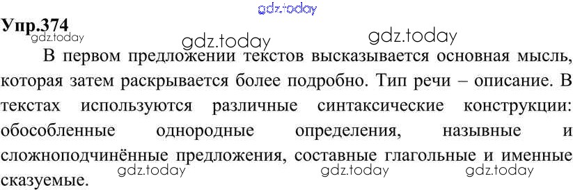 На страницах сайта gdz.today вы найдете учебный и вспомогательный материал, направленный на улучшения знаний школьной программы. ГДЗ - онлайн мир знаний Решение к упражнениям 374 Учебнику по Русскому языку для 8 класса Разумовская, Львова Дрофа Вертикаль 2013