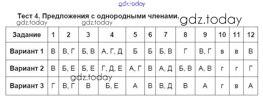 Ответы к Решение к тестам Тест №4. Предложения с однородными членами Тестовым заданиям по Русскому языку для 8 класса Малюшкин Сфера 2019