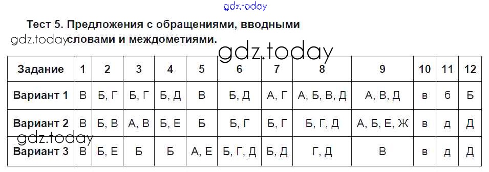 На страницах сайта gdz.today вы найдете учебный и вспомогательный материал, направленный на улучшения знаний школьной программы. ГДЗ - онлайн мир знаний Решение к тестам Тест №5. Предложения с обращениями, вводными словами и междометиями Тестовым заданиям по Русскому языку для 8 класса Малюшкин Сфера 2019