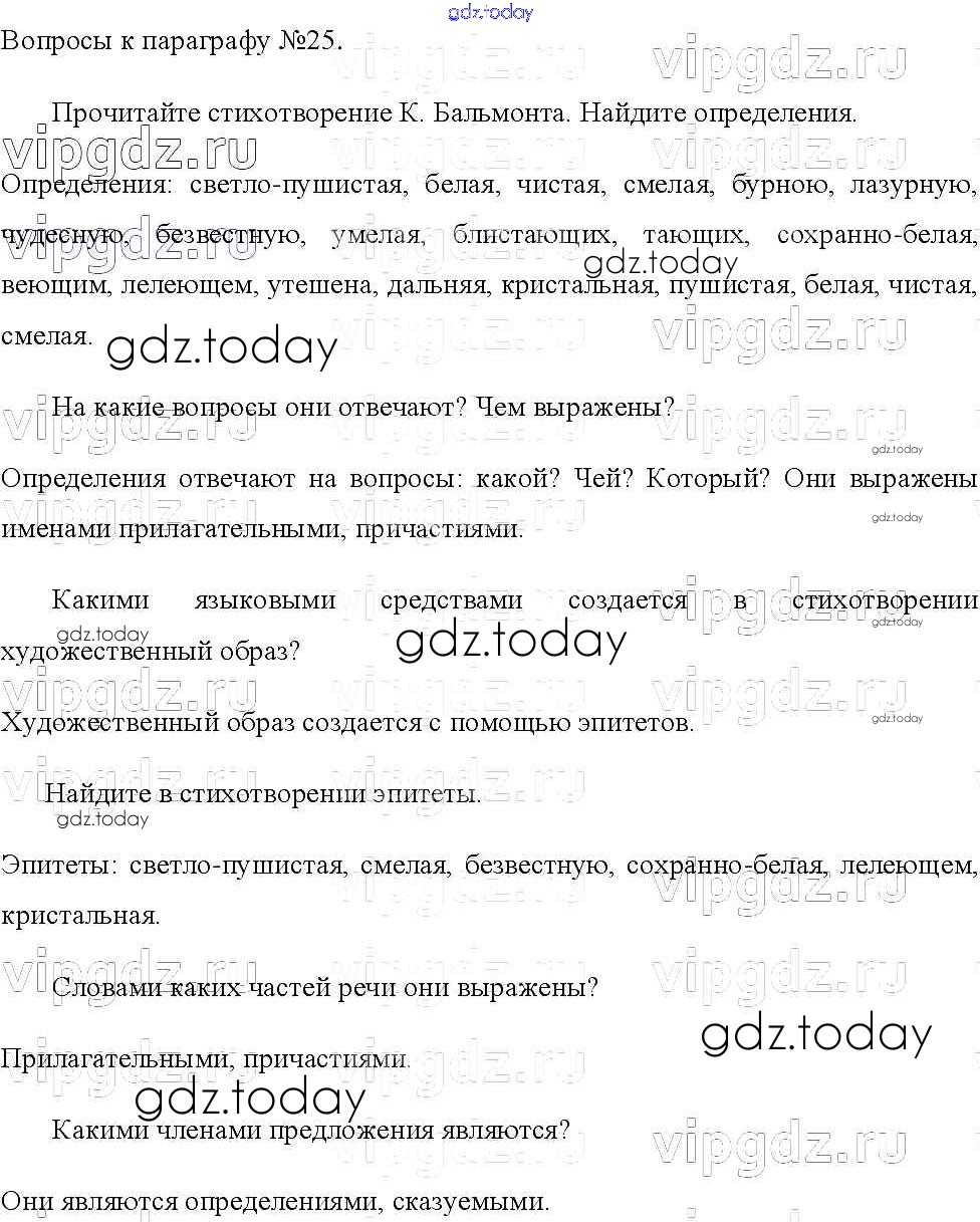 На страницах сайта gdz.today вы найдете учебный и вспомогательный материал, направленный на улучшения знаний школьной программы. ГДЗ - онлайн мир знаний Решение к вопросам к параграфам §25 Учебнику по Русскому языку для 8 класса Тростенцова, Ладыженская Просвещение 2014