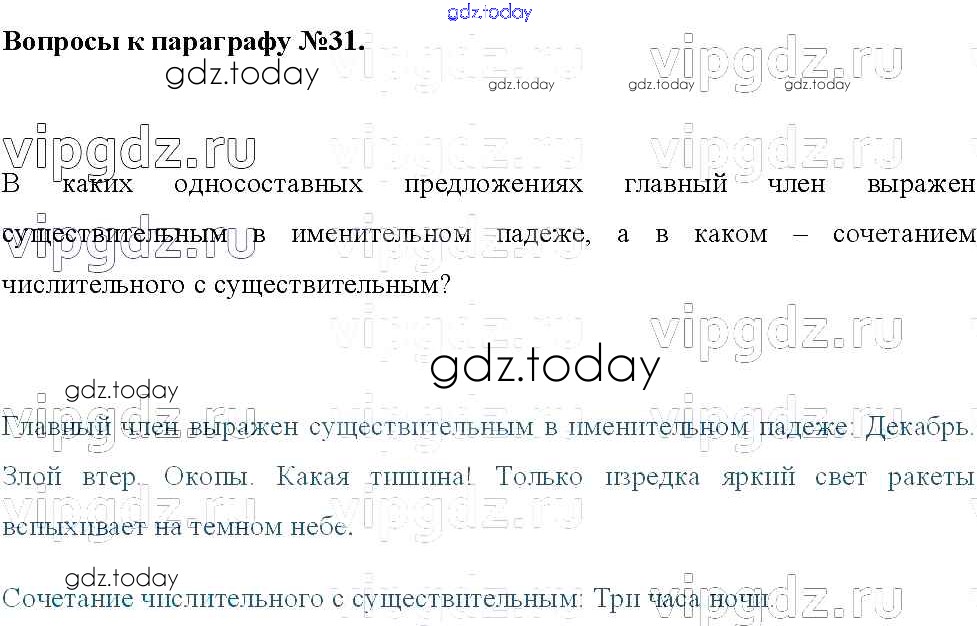 На страницах сайта gdz.today вы найдете учебный и вспомогательный материал, направленный на улучшения знаний школьной программы. ГДЗ - онлайн мир знаний Решение к вопросам к параграфам §31 Учебнику по Русскому языку для 8 класса Тростенцова, Ладыженская Просвещение 2014