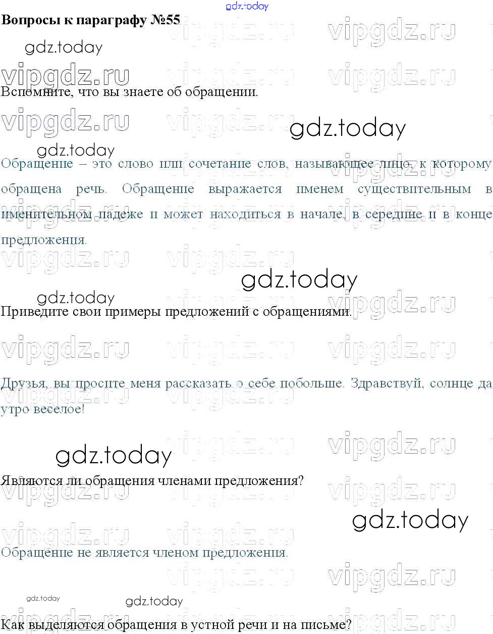 На страницах сайта gdz.today вы найдете учебный и вспомогательный материал, направленный на улучшения знаний школьной программы. ГДЗ - онлайн мир знаний Решение к вопросам к параграфам §55 Учебнику по Русскому языку для 8 класса Тростенцова, Ладыженская Просвещение 2014
