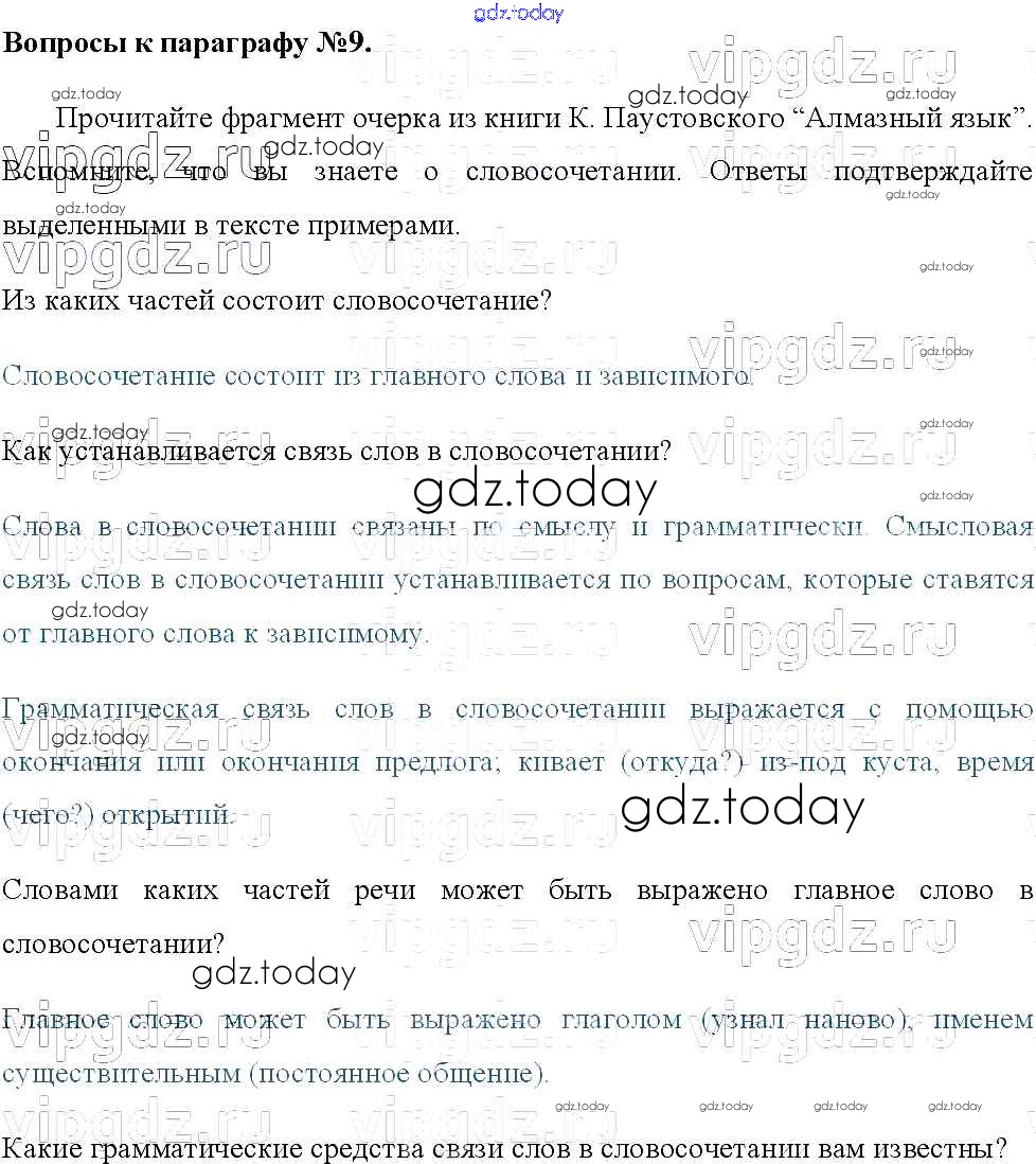 На страницах сайта gdz.today вы найдете учебный и вспомогательный материал, направленный на улучшения знаний школьной программы. ГДЗ - онлайн мир знаний Решение к вопросам к параграфам §9 Учебнику по Русскому языку для 8 класса Тростенцова, Ладыженская Просвещение 2014