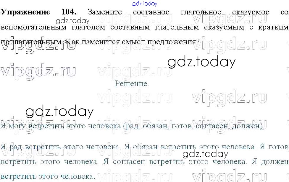 Ответы к Решение к упражнениям 104 Учебнику по Русскому языку для 8 класса Тростенцова, Ладыженская Просвещение 2014