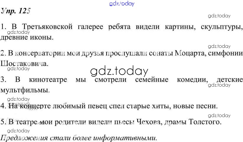 На страницах сайта gdz.today вы найдете учебный и вспомогательный материал, направленный на улучшения знаний школьной программы. ГДЗ - онлайн мир знаний Решение к упражнениям 125 Учебнику по Русскому языку для 8 класса Тростенцова, Ладыженская Просвещение 2014