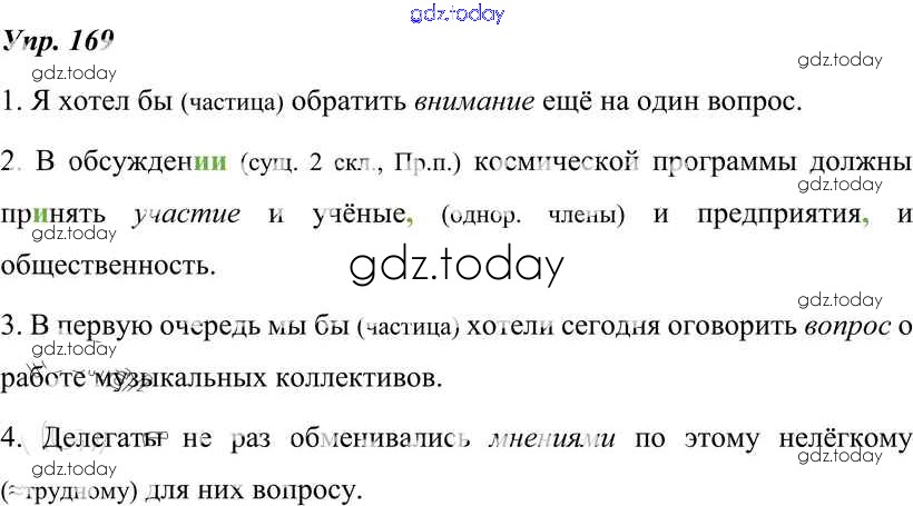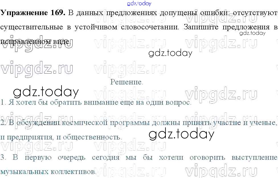 На страницах сайта gdz.today вы найдете учебный и вспомогательный материал, направленный на улучшения знаний школьной программы. ГДЗ - онлайн мир знаний Решение к упражнениям 169 Учебнику по Русскому языку для 8 класса Тростенцова, Ладыженская Просвещение 2014