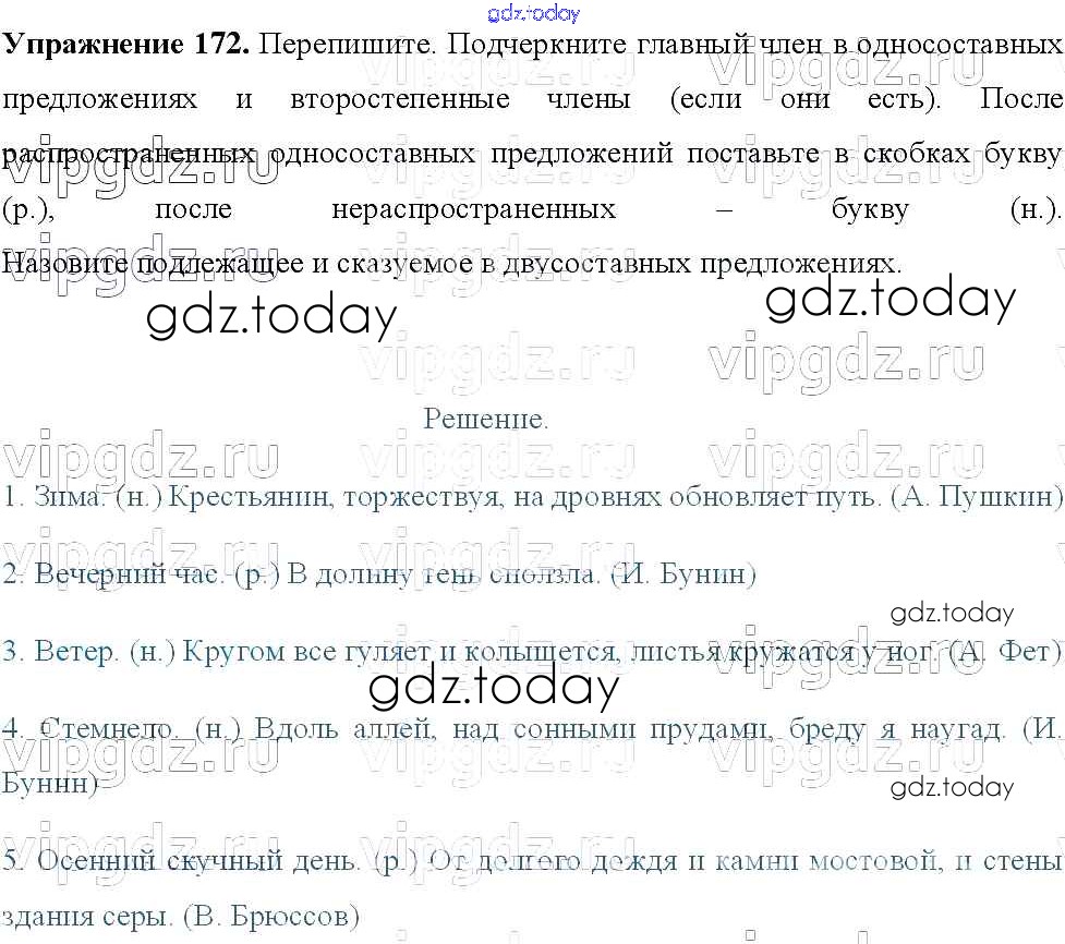 Ответы к Решение к упражнениям 172 Учебнику по Русскому языку для 8 класса Тростенцова, Ладыженская Просвещение 2014