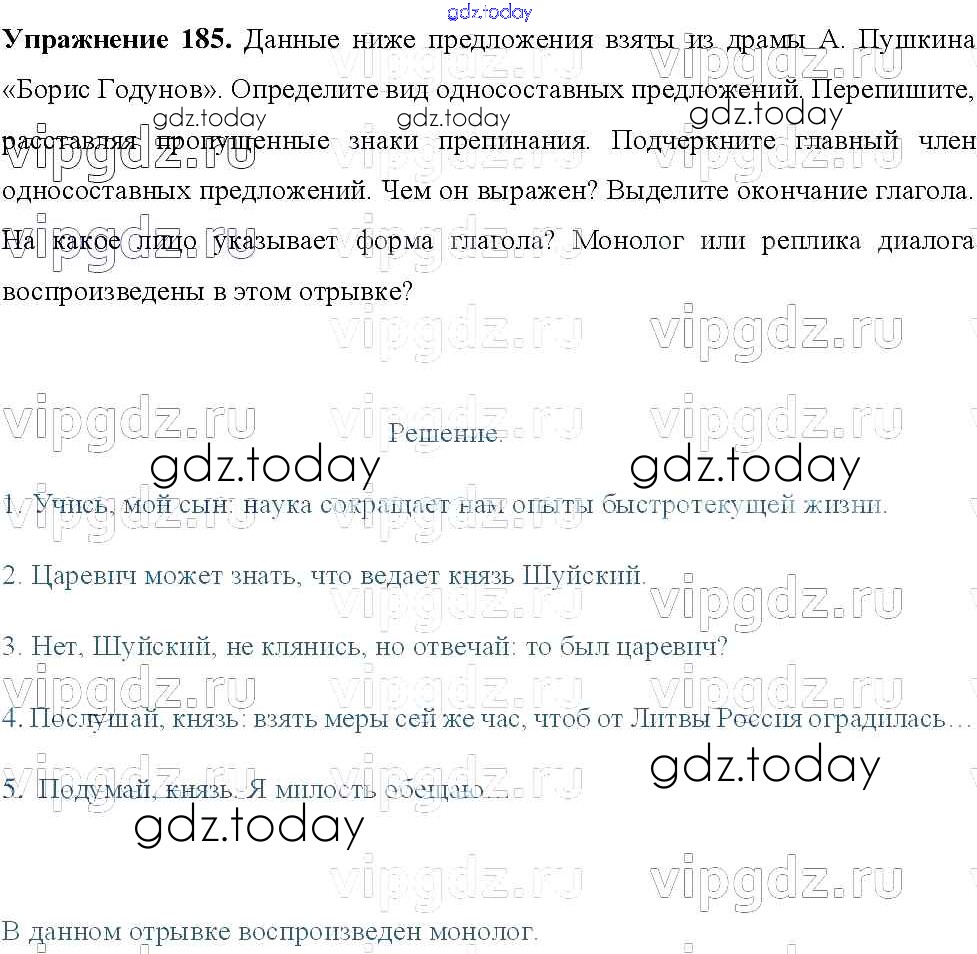 Ответы к Решение к упражнениям 185 Учебнику по Русскому языку для 8 класса Тростенцова, Ладыженская Просвещение 2014