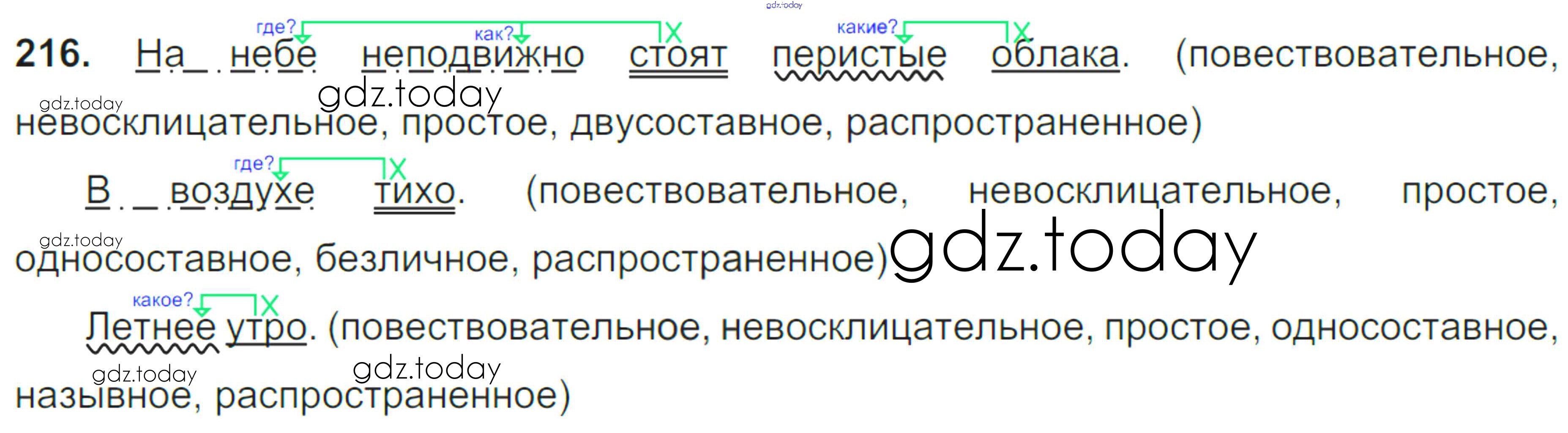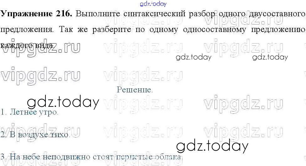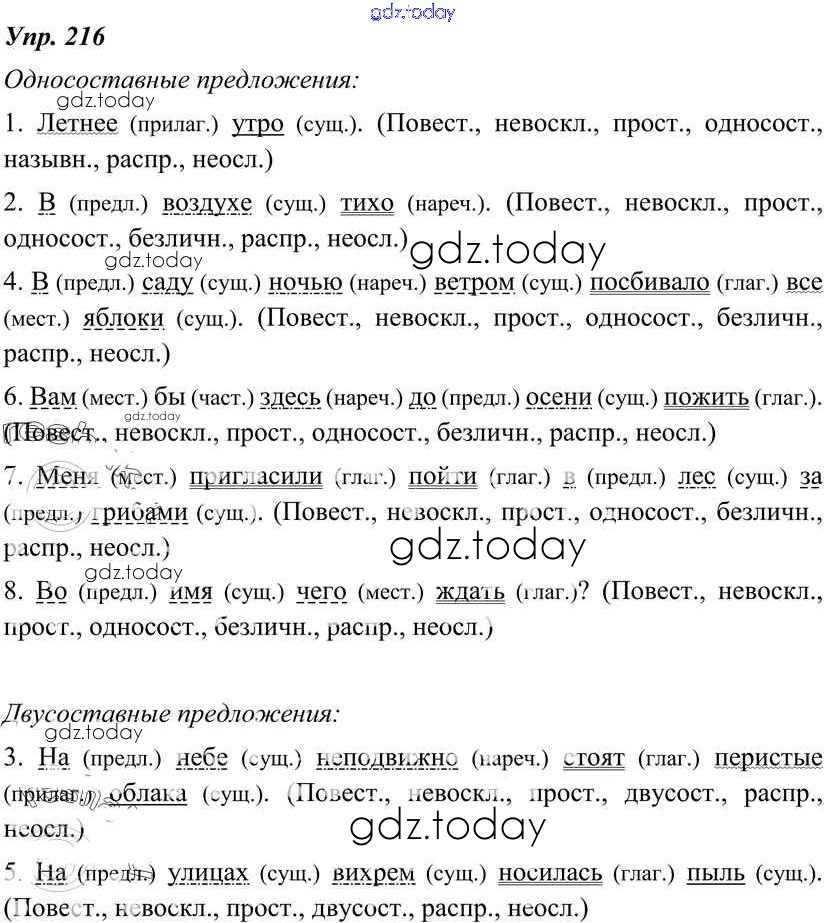 На страницах сайта gdz.today вы найдете учебный и вспомогательный материал, направленный на улучшения знаний школьной программы. ГДЗ - онлайн мир знаний Решение к упражнениям 216 Учебнику по Русскому языку для 8 класса Тростенцова, Ладыженская Просвещение 2014