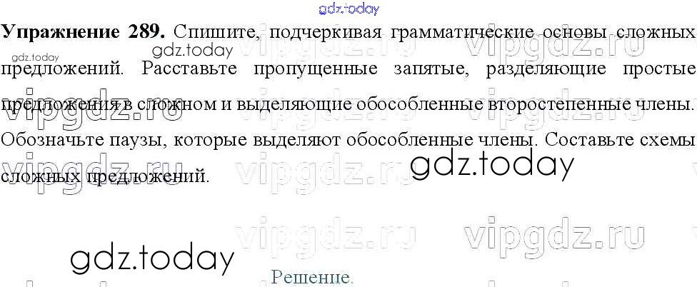 Ответы к Решение к упражнениям 289 Учебнику по Русскому языку для 8 класса Тростенцова, Ладыженская Просвещение 2014