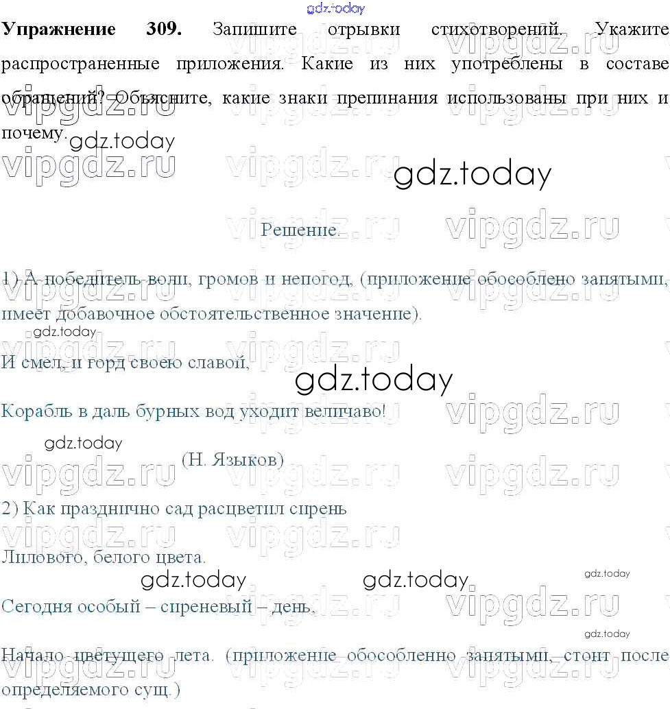 Ответы к Решение к упражнениям 309 Учебнику по Русскому языку для 8 класса Тростенцова, Ладыженская Просвещение 2014