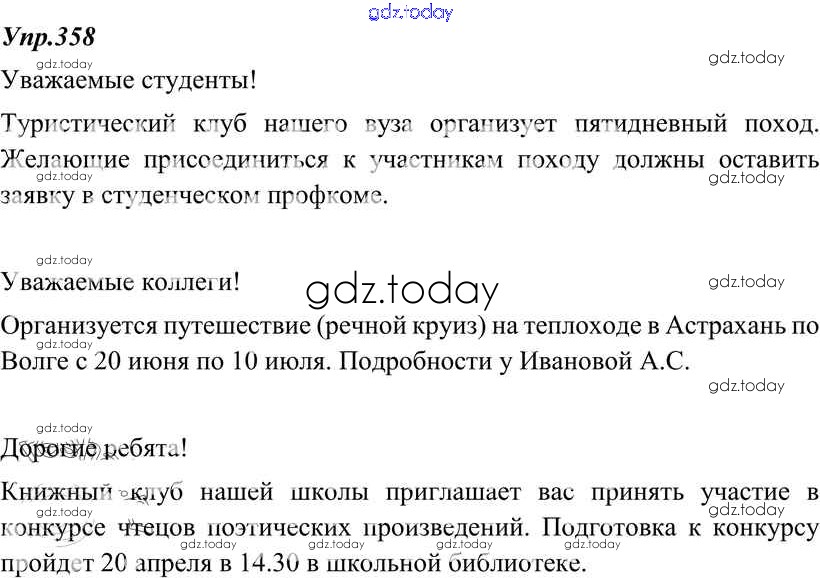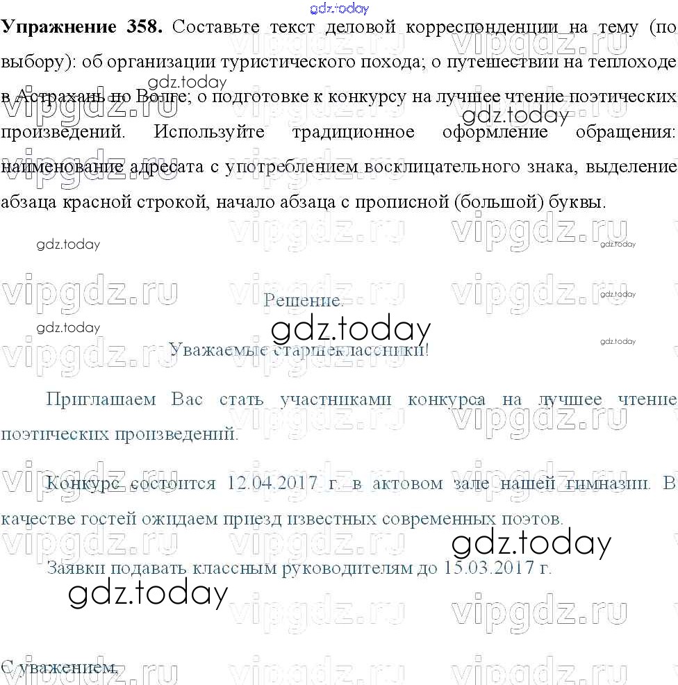 На страницах сайта gdz.today вы найдете учебный и вспомогательный материал, направленный на улучшения знаний школьной программы. ГДЗ - онлайн мир знаний Решение к упражнениям 358 Учебнику по Русскому языку для 8 класса Тростенцова, Ладыженская Просвещение 2014