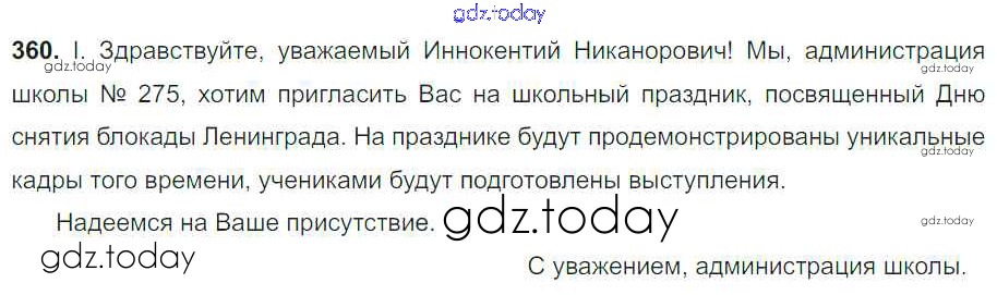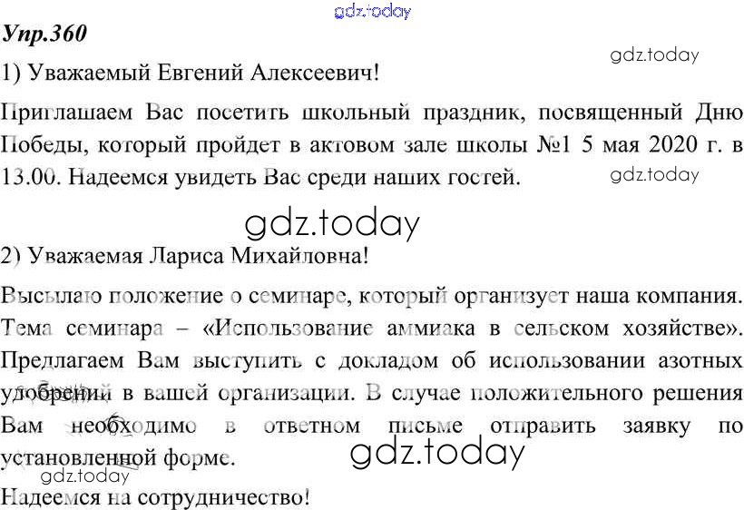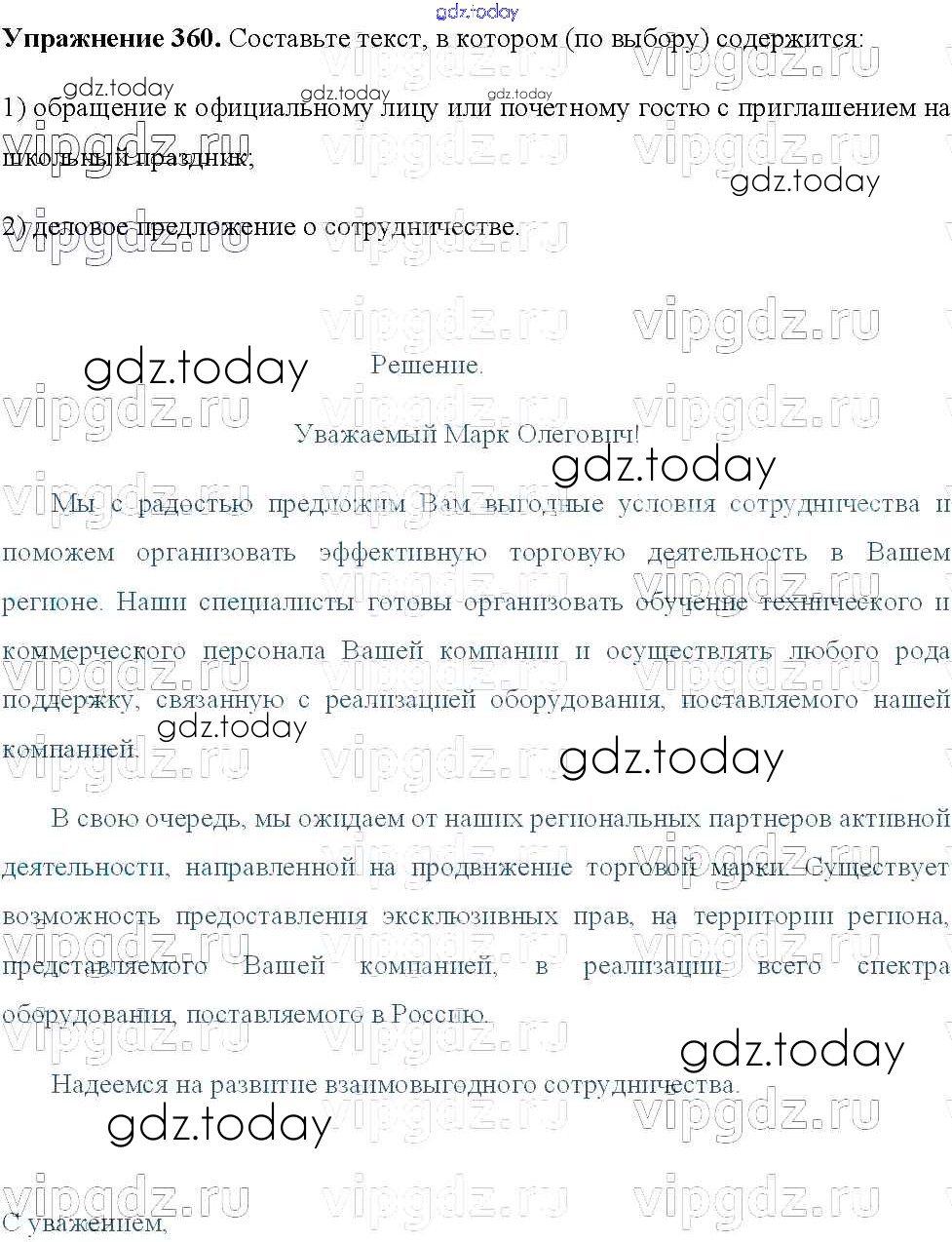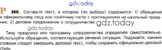На страницах сайта gdz.today вы найдете учебный и вспомогательный материал, направленный на улучшения знаний школьной программы. ГДЗ - онлайн мир знаний Решение к упражнениям 360 Учебнику по Русскому языку для 8 класса Тростенцова, Ладыженская Просвещение 2014