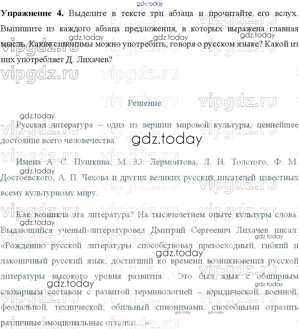 Ответы к Решение к упражнениям 4 Учебнику по Русскому языку для 8 класса Тростенцова, Ладыженская Просвещение 2014