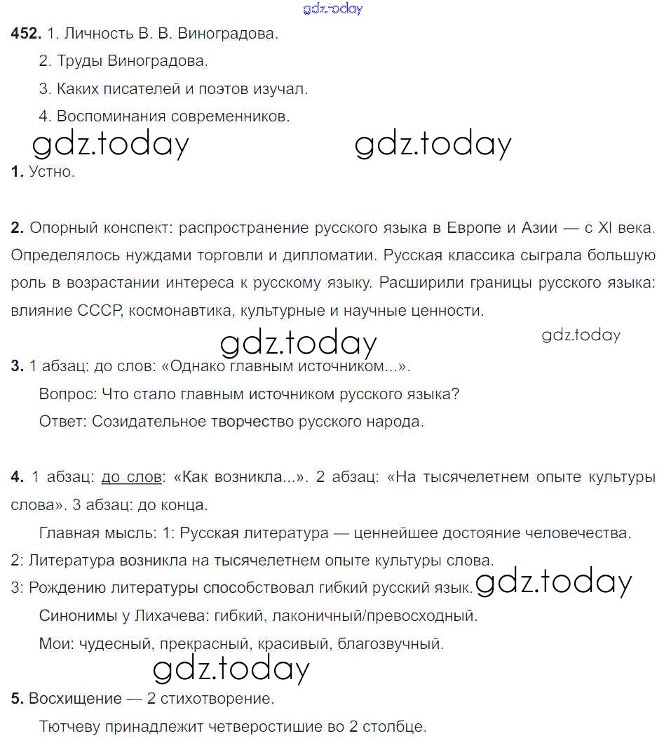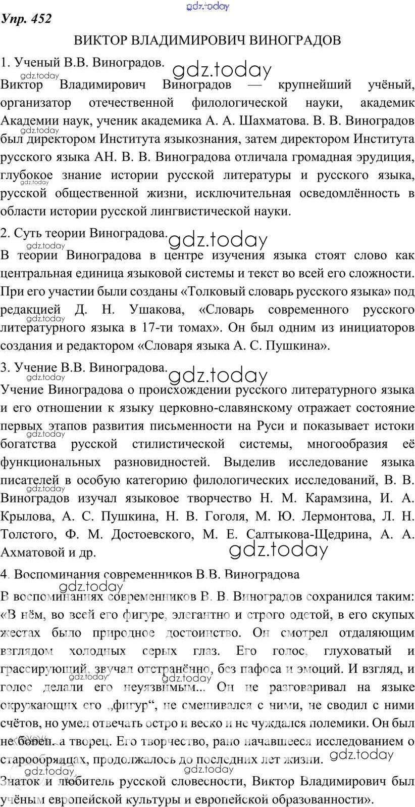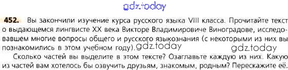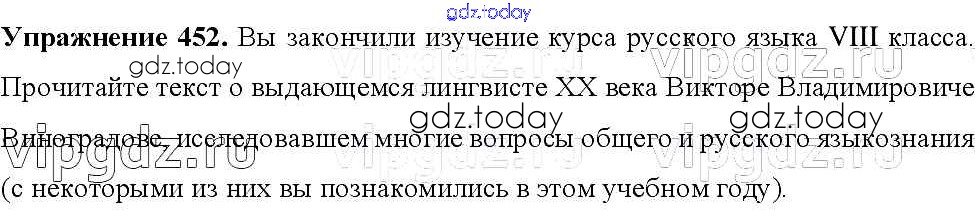 На страницах сайта gdz.today вы найдете учебный и вспомогательный материал, направленный на улучшения знаний школьной программы. ГДЗ - онлайн мир знаний Решение к упражнениям 452 Учебнику по Русскому языку для 8 класса Тростенцова, Ладыженская Просвещение 2014