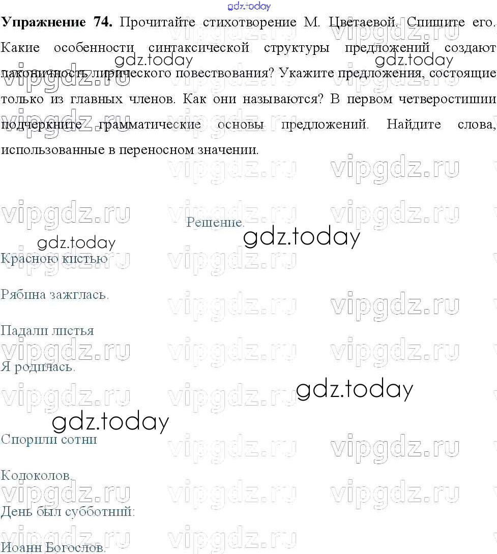 Ответы к Решение к упражнениям 74 Учебнику по Русскому языку для 8 класса Тростенцова, Ладыженская Просвещение 2014