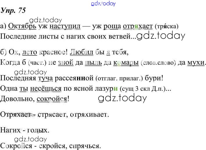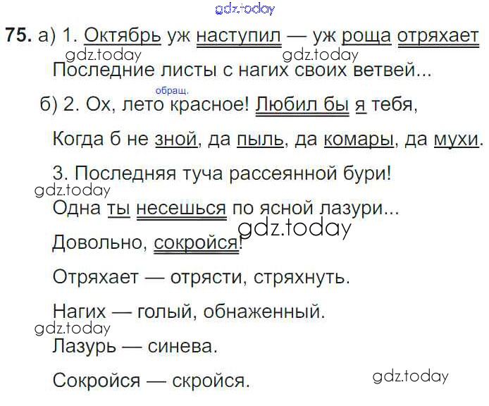 На страницах сайта gdz.today вы найдете учебный и вспомогательный материал, направленный на улучшения знаний школьной программы. ГДЗ - онлайн мир знаний Решение к упражнениям 75 Учебнику по Русскому языку для 8 класса Тростенцова, Ладыженская Просвещение 2014