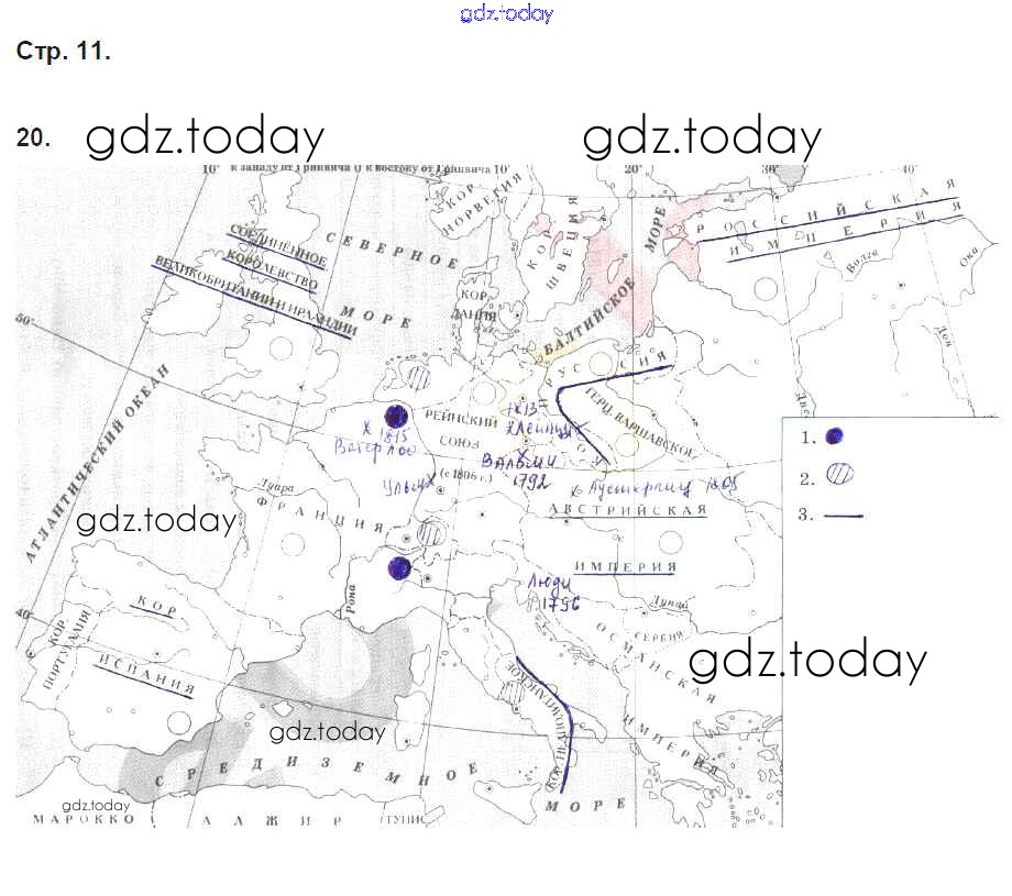 На страницах сайта gdz.today вы найдете учебный и вспомогательный материал, направленный на улучшения знаний школьной программы. ГДЗ - онлайн мир знаний Страницы (решение) 11 Рабочей тетради с контурными картами по Всеобщей истории для 8 класса Волкова, Пономарев Дрофа УМК 2018