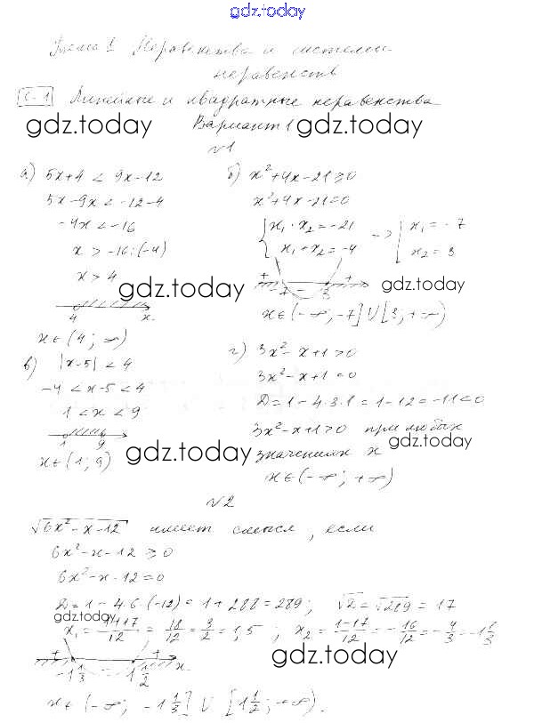 На страницах сайта gdz.today вы найдете учебный и вспомогательный материал, направленный на улучшения знаний школьной программы. ГДЗ - онлайн мир знаний СР-1. Линейные и квадратные неравенства Решение к теме 1. Неравенства и системы неравенств вариант 1 Самостоятельным работам по Алгебре для 9 класса Александрова Базовый уровень Мнемозина УМК 2016