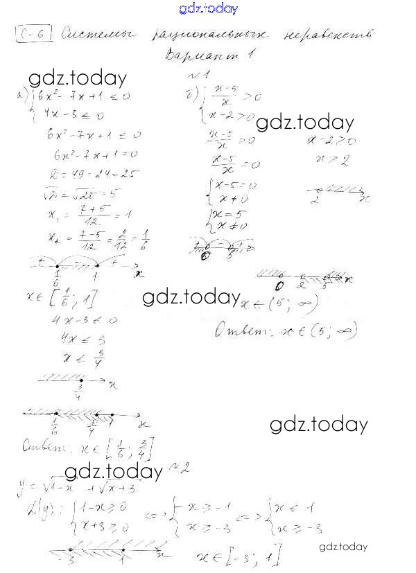 На страницах сайта gdz.today вы найдете учебный и вспомогательный материал, направленный на улучшения знаний школьной программы. ГДЗ - онлайн мир знаний СР-6. Системы рациональных неравенств Решение к теме 1. Неравенства и системы неравенств вариант 1 Самостоятельным работам по Алгебре для 9 класса Александрова Базовый уровень Мнемозина УМК 2016