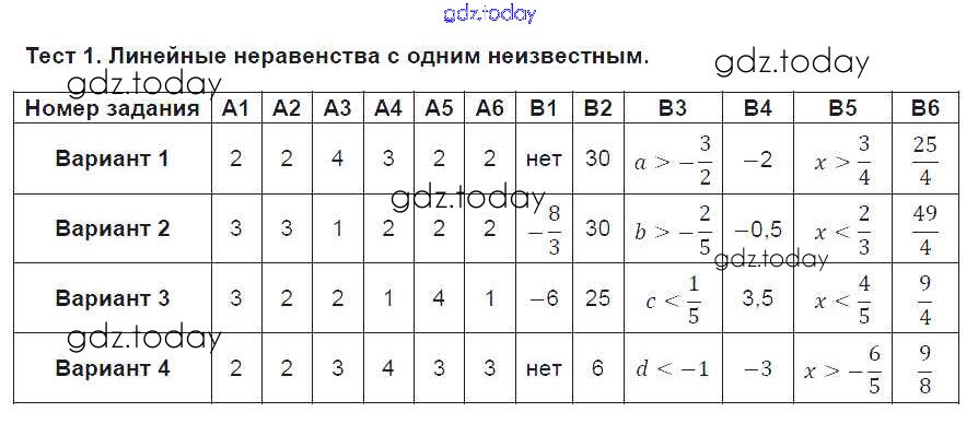На страницах сайта gdz.today вы найдете учебный и вспомогательный материал, направленный на улучшения знаний школьной программы. ГДЗ - онлайн мир знаний Решение к тестам Тест №1. Линейные неравенства с одним неизвестным Тематическим тестам по Алгебре для 9 класса Чулков, Струков Просвещение 2017