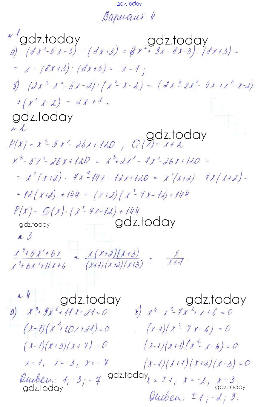 Ответы к СР-1. Деление многочленов. Решение алгебраических уравнений Решение к самостоятельным работам вариант 4 Дидактическим материалам по Алгебре для 9 класса Зив, Гольдич Виктория плюс 2013