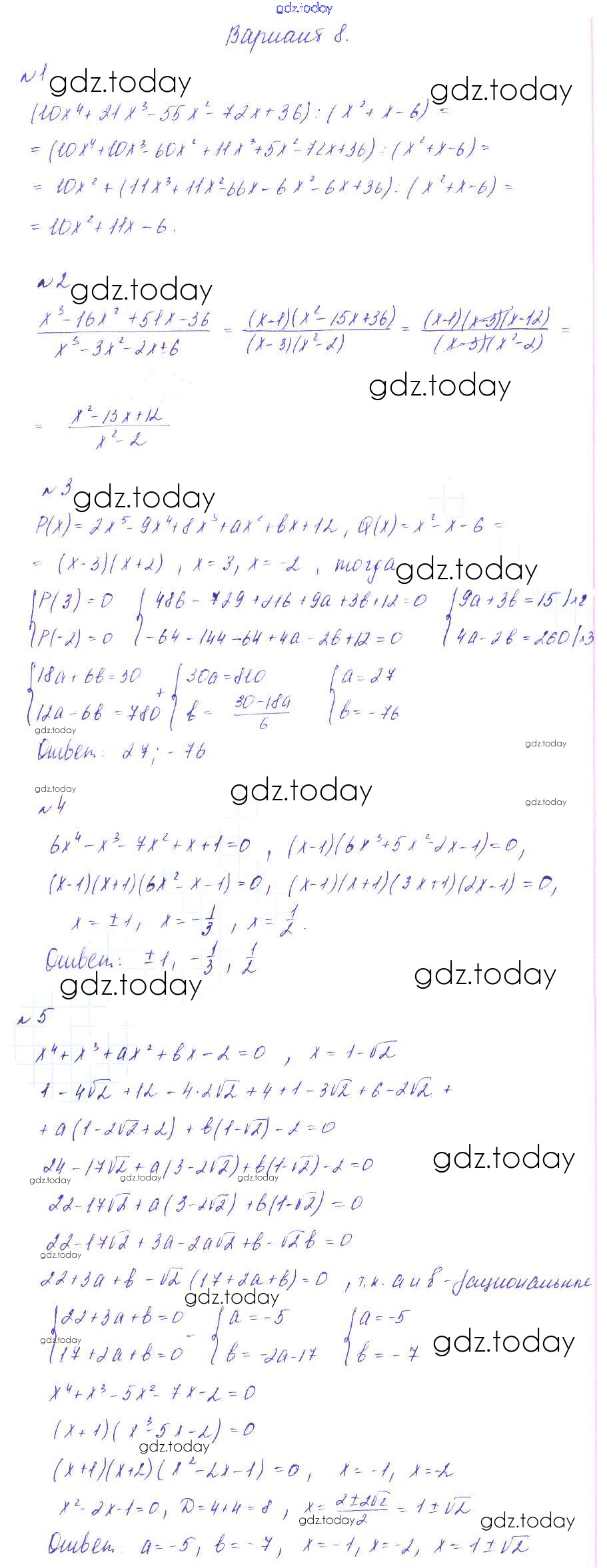Ответы к СР-1. Деление многочленов. Решение алгебраических уравнений Решение к самостоятельным работам вариант 8 Дидактическим материалам по Алгебре для 9 класса Зив, Гольдич Виктория плюс 2013