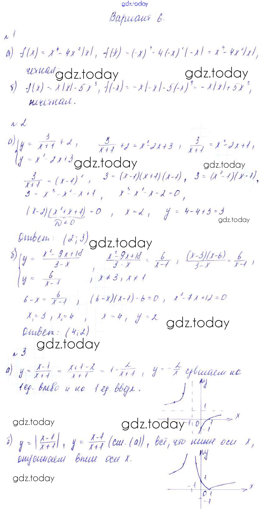 На страницах сайта gdz.today вы найдете учебный и вспомогательный материал, направленный на улучшения знаний школьной программы. ГДЗ - онлайн мир знаний СР-10. Четность и нечетность функции. Функция у = k делить на х Решение к самостоятельным работам вариант 6 Дидактическим материалам по Алгебре для 9 класса Зив, Гольдич Виктория плюс 2013
