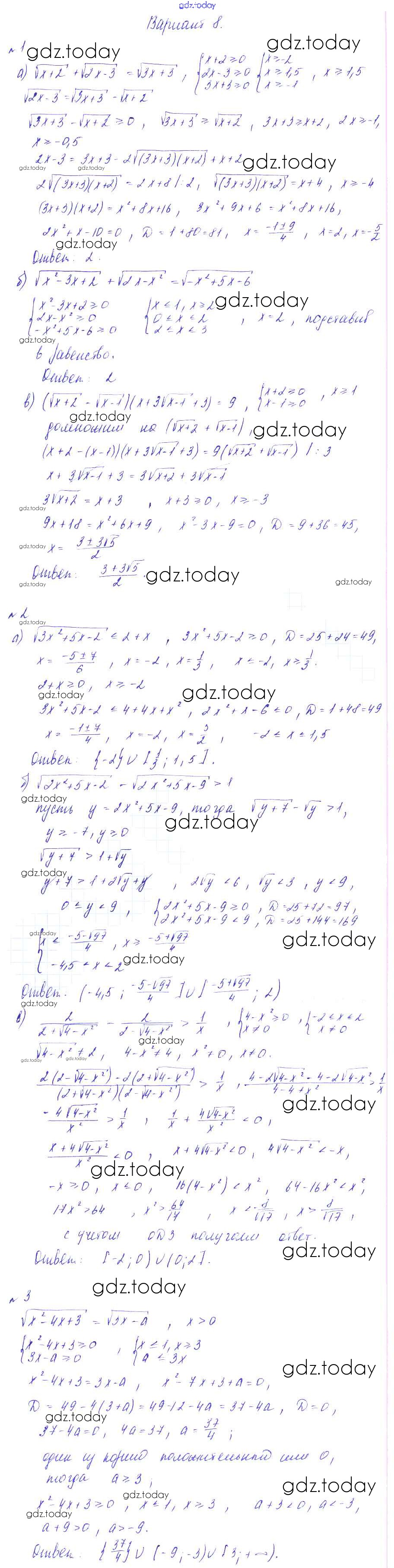 На страницах сайта gdz.today вы найдете учебный и вспомогательный материал, направленный на улучшения знаний школьной программы. ГДЗ - онлайн мир знаний СР-11. Неравенства и уравнения, содержащие степень Решение к самостоятельным работам вариант 8 Дидактическим материалам по Алгебре для 9 класса Зив, Гольдич Виктория плюс 2013