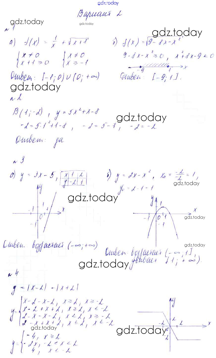 На страницах сайта gdz.today вы найдете учебный и вспомогательный материал, направленный на улучшения знаний школьной программы. ГДЗ - онлайн мир знаний СР-9. Область определения функции. Возрастание и убывание функции Решение к самостоятельным работам вариант 2 Дидактическим материалам по Алгебре для 9 класса Зив, Гольдич Виктория плюс 2013
