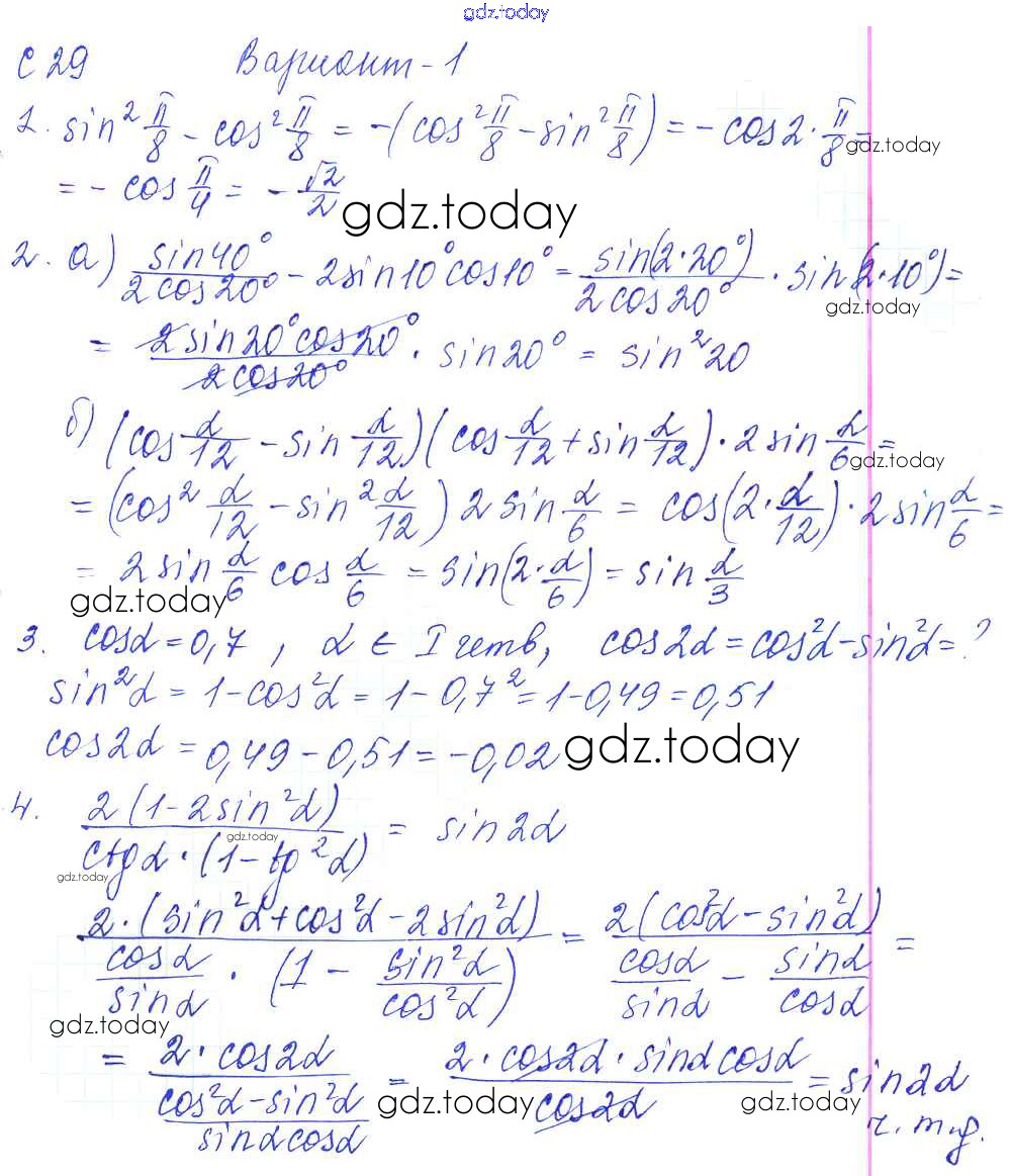 На страницах сайта gdz.today вы найдете учебный и вспомогательный материал, направленный на улучшения знаний школьной программы. ГДЗ - онлайн мир знаний С-29. Формулы двойного угла Решение к самостоятельным работам Вариант №1 Контрольным и самостоятельным работам по Алгебре для 9 класса Журавлев, Малышева Экзамен УМК 2016