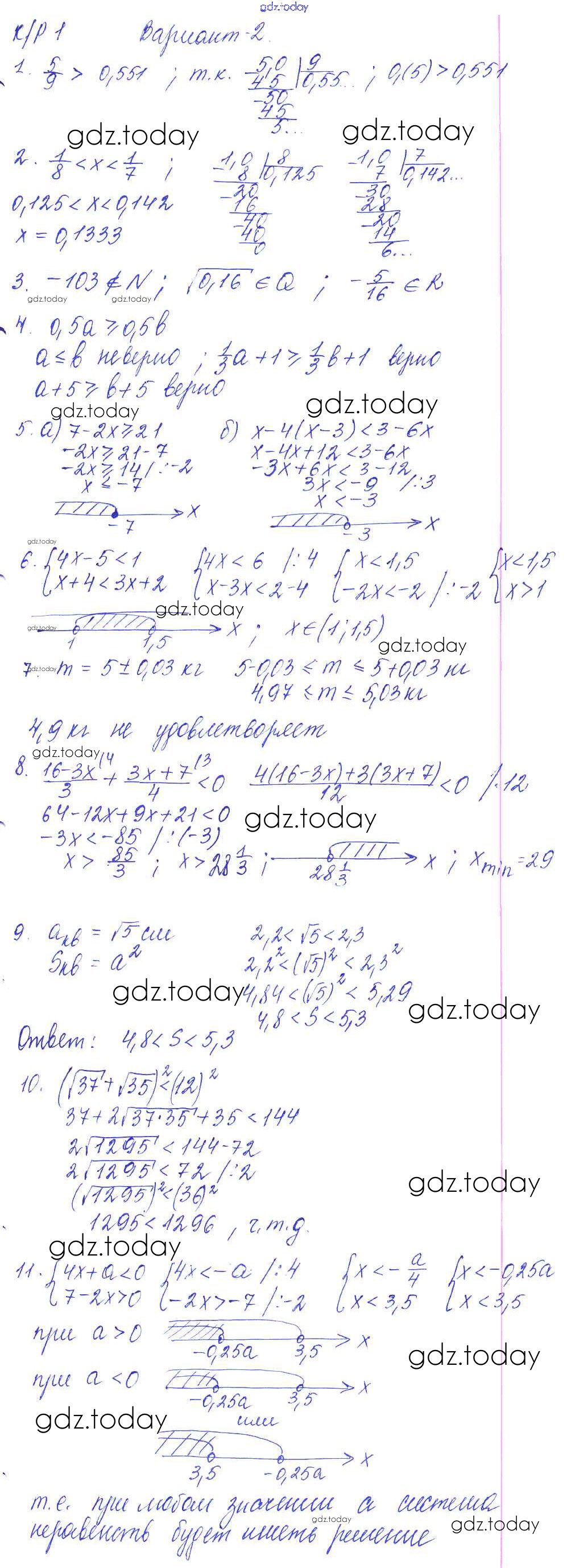 На страницах сайта gdz.today вы найдете учебный и вспомогательный материал, направленный на улучшения знаний школьной программы. ГДЗ - онлайн мир знаний Решение к КР-1. Неравенства вариант №2 Контрольным работам по Алгебре для 9 класса Кузнецова, Минаева Просвещение 2016