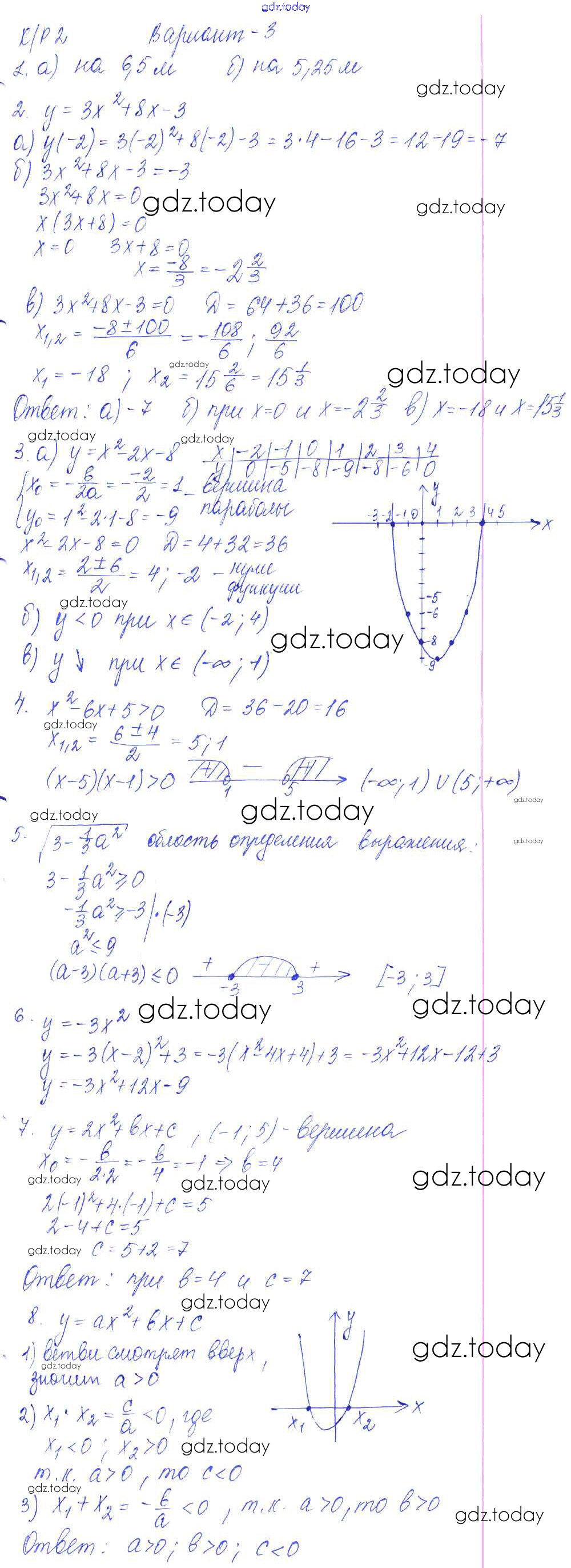 Ответы к Решение к КР-2. Квадратичная функция вариант №3 Контрольным работам по Алгебре для 9 класса Кузнецова, Минаева Просвещение 2016
